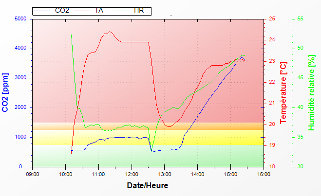 – Soit, de préférence, en fonction de la teneur en CO2 mesurée en temps réel et déclenchant une alarme à partir du moment ou un seuil paramétrable (par exemple 1200 ppm) est atteint.